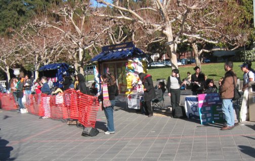 At UC Berkeley, the student group Students for Justice in Palestine (better known as SJP) chose this symbolic day to stage a peculiar bit of anti-Israel street theater. Their grandiose goal was to create a "bypass road" across Sproul Plaza, thereby compelling students to experience the same inconveniences that the Palestinians endure.