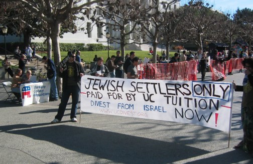 Perhaps coincidentally, the protesters positioned themselves so that the road connected the Hillel booth at one end...