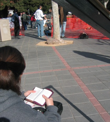 Here's a view of the entire "road" -- marked by protesters holding orange netting. As you can see, there were only enough protesters to hold about 20 yards of netting. Because of the meager turnout, passing students were for the most part not even aware that there was any kind of "road" blocking their way. Most just kept walking without giving it any notice.