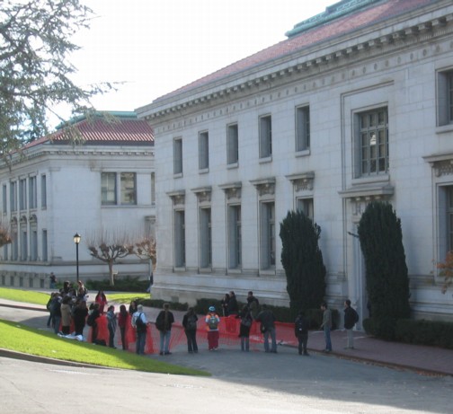 But wait! Before calling it a day, they stopped off at California Hall, which holds the university's administration offices, to belt out a few more chants and call for divestment from Israel. Separated from all the crowds and bystanders on Sproul Plaza, the rally was revealed to consist of only about 20 protesters. Standing all by themselves in the chilly shadow of California Hall, they looked a bit pathetic.