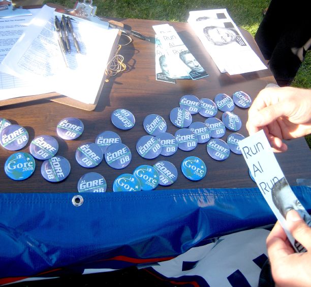 Outside the lecture hall, a plethora of Gore-heads had set up tables. The message was the same at all of them: Gore in '08!