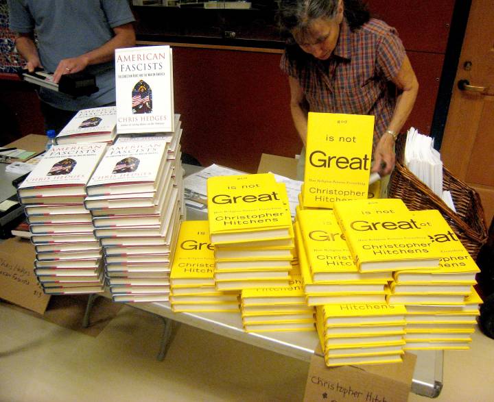 Hedges is merely a well-read and well-traveled man, but lacks any ability to put those experiences in proper context as was on full display when he dopily proclaimed that "biblical literalists do not exist". Uh what??? He also fueled the flame heartily when he told the crowd, some of whom were actually there to see him (although just a couple), that "once religious stories are written, they decay into literature". You would have thought he had just done a ghetto "Yo mama" line. Hitchens, with all of his energy and passion, reminded Hedges that to say anything "decays into literature" is to not fully understand the value and power of the written word.