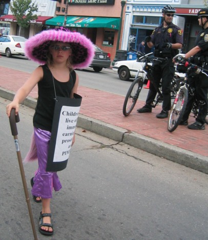 The message of this pro-anti-"prostiution" group turned out to be so muddled that suddenly I was unsure of my footing again. Exactly why did you dress up your eight-year-old child as a pimp?