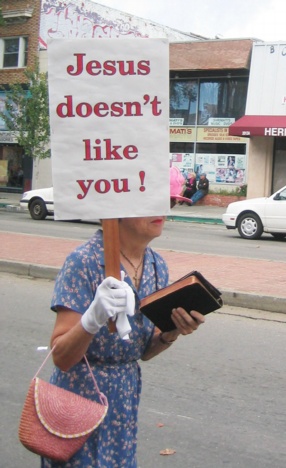 For example, the Jehovah's Witnesses Against Soliciting. Satire -- or real? Their retro clothes suggested satire, but they never once stepped out of character. I carefully read all the literature they were handing out and it certainly seemed sincere. But they appeared too young and too pseudo-intellectual to be authentic, so in this case I'd cast my vote for "satire."