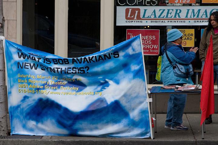 World Can't Wait even went so far as to drop the mask entirely at this protest, putting up a table about Bob Avakian (the exiled leader of the Revolutionary Communist Party, and the focus of their cult of personality), and hoisting the red RCP flag. The website "Discover the Networks" has a good page summarizing the Maoist philosophy of the Revolutionary Communist Party, and mentioning how World Can't Wait is an offshoot of it.