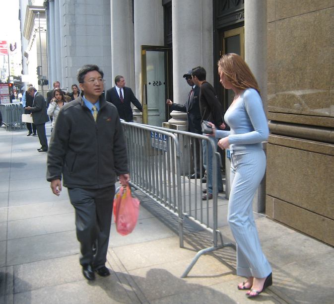 The Israeli consulate was also one of the sites on the list, but they were ready ahead of time and had set up barricades and numerous guards to prevent anyone unauthorized from getting into the building. Here we see one of the Israeli consulate employees leaving the office; not a single protester in sight. (Though they might have made an appearance earlier in the day, for all I know.)