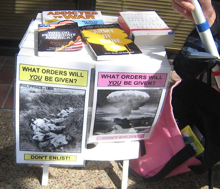 I chose the 'napalm girl' photo knowing that it was a South Vietnamese pilot who dropped the bomb. The bombing was done in coordination with US forces, so it does represent a war casualty with American participation in the decision. I also knew that the National Guard was responsible for the Kent State shooting, but since the National Guard is being used so heavily in the Iraq War, I don't see the distinction you're trying to draw between them and the U.S. military. and no, the intent of my display is not to imply that 'American commanders routinely give orders to commit atrocities:' I believe that most members of the armed services (including the commanders) are honorable people doing their best to serve our country and the values it stands for. My signs are intended to provoke thinking by potential recruits."]