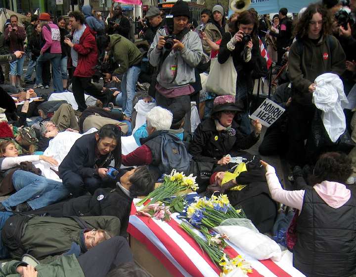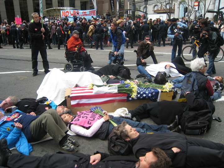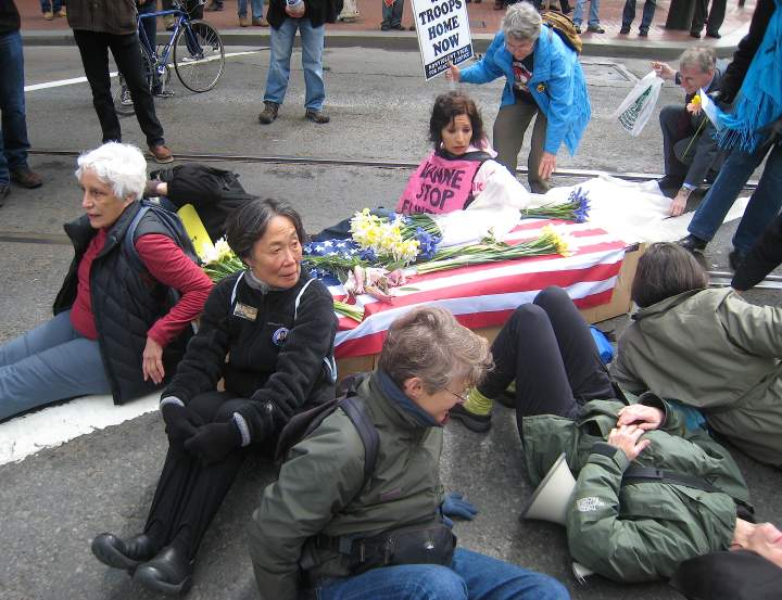 Things kicked into high gear when a small group of dedicated activists carried a mock coffin into the middle of Market Street and sat down, blocking traffic.