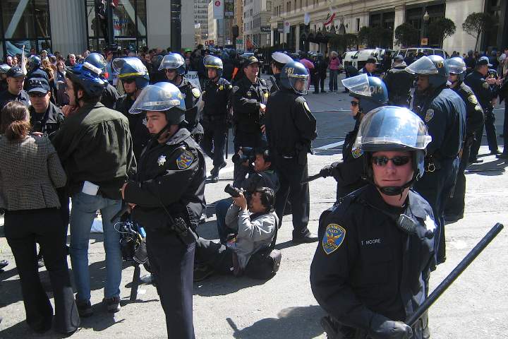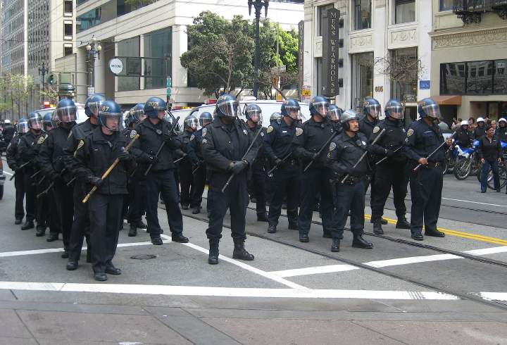 The captain in charge announced through a megaphone that anyone not on the sidewalk would be subject to arrest.