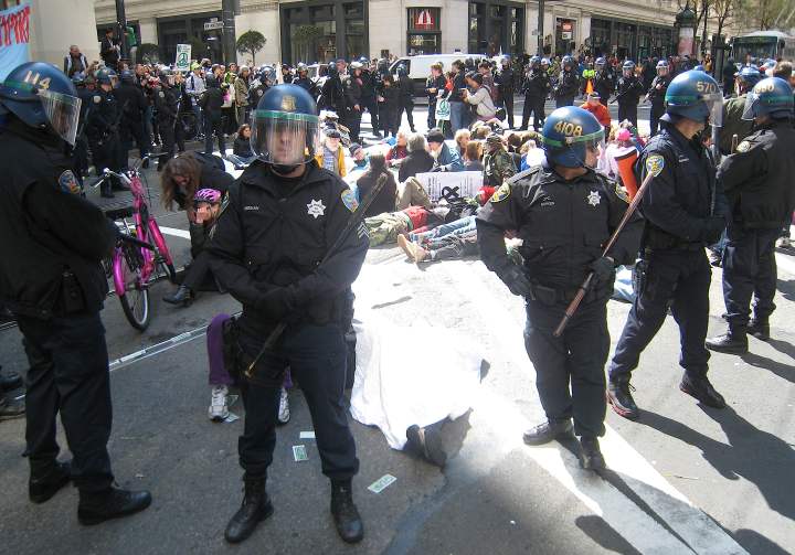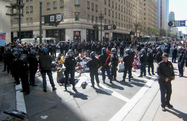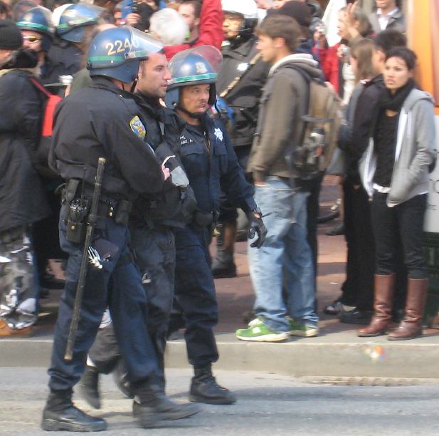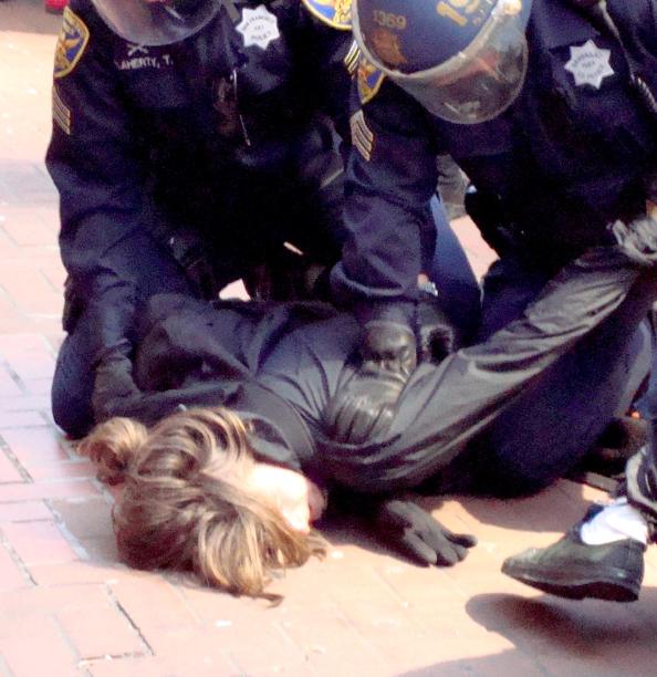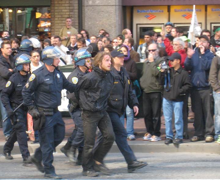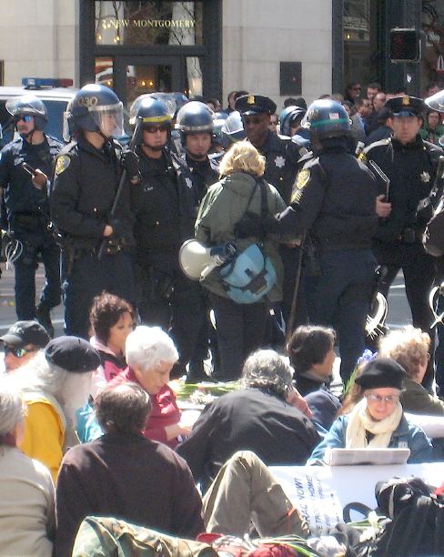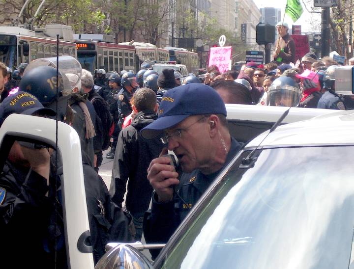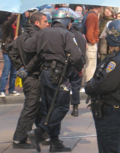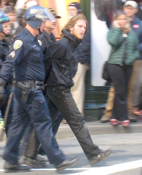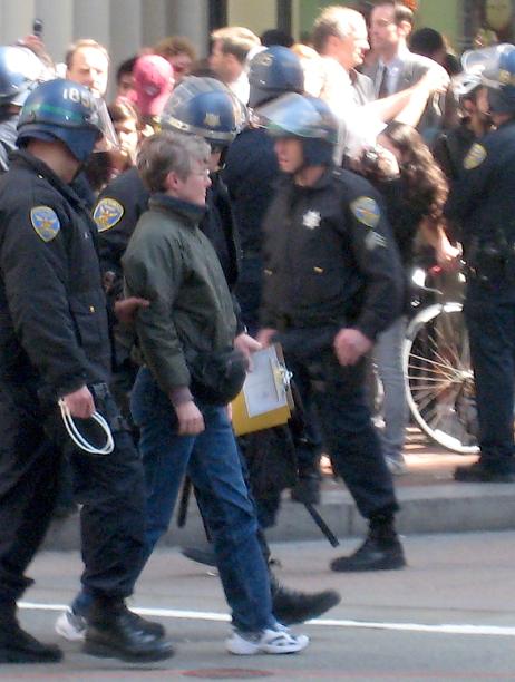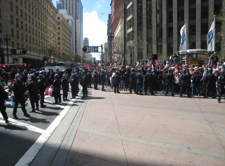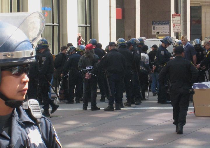 Having successfully taken control of the situation, the police started arresting protesters one by one. Notice the electric Muni buses lined up down Market Street: because they run off of electric power lines overhead, they are unable to alter their routes, so the entire bus system got screwed up.