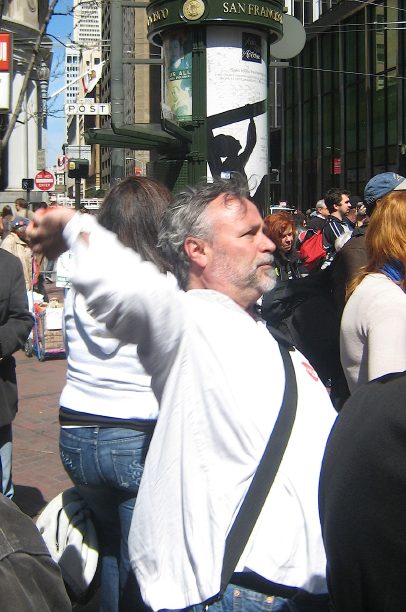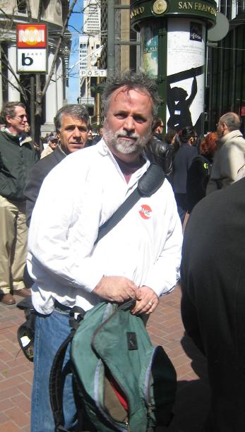 The first half of the day was supposed to revolve around a series of "direct actions" in San Francisco's Financial District, in front of various corporations deemed by the organizers to be "war profiteers." The direct actions were supposed to be coordinated from two locations on Market Street (the city's main thoroughfare). As things played out, however, the direct actions were too scattered and too ill-attended, so the focus of the protest became Market Street itself, where everyone was congregating as we waited for instructions on what to do.