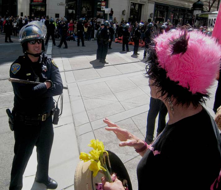 One of the cops made the terrible, terrible mistake of actually engaging a Code Pink member in a discussion. What are you, a rookie? Don't encourage these people! They thrive on attention!