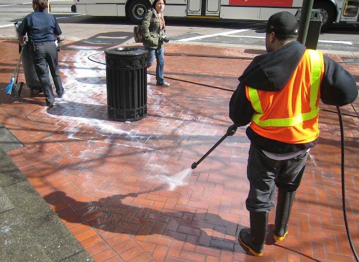 Eventually, everyone blocking the street was arrested, the excitement died down, and all the protesters wandered away (to re-group later that evening at Civic Center). The city clean-up crew was summoned, and they power-sprayed away all the politics. Half an hour after the protest wrapped up, there was no evidence it had ever even happened.