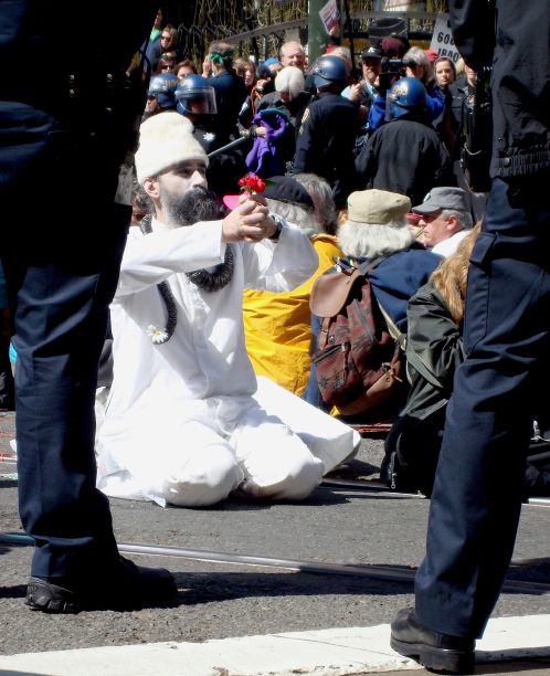 This oddball (whom you'll meet in other sections of the report as well) obviously had studied photographs of old Vietnam War-era protests, and offered a flower to one of the policemen (reminiscent of famous photos of hippies offering flowers to National Guardsmen during various late-'60s riots).