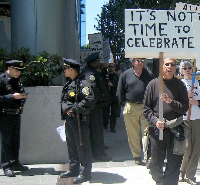But that group of protesters was only half the story. Another coalition of anti-Israel groups was allowed to protest directly in front of the festival entrance itself, including Bay Area Women in Black, Jews for "Peace" and "Justice," "Jewish" "Voice" "for" "Peace," and similar far-left organizations. The difference between the two halves of the protest was this: If you overtly and aggressively called for Israel to be destroyed and for the Jews to be pushed into the sea, the rule was you had to stay across the street; but if you pretended to want the "peace" of the innocuous-sounding "one-state solution," and assumed the mantle of naivité (as if you didn't know full well that your "solution" was just a euphemism for the Palestinian takeover of Israel), well, then you were allowed to get closer, because you obviously must be harmless.