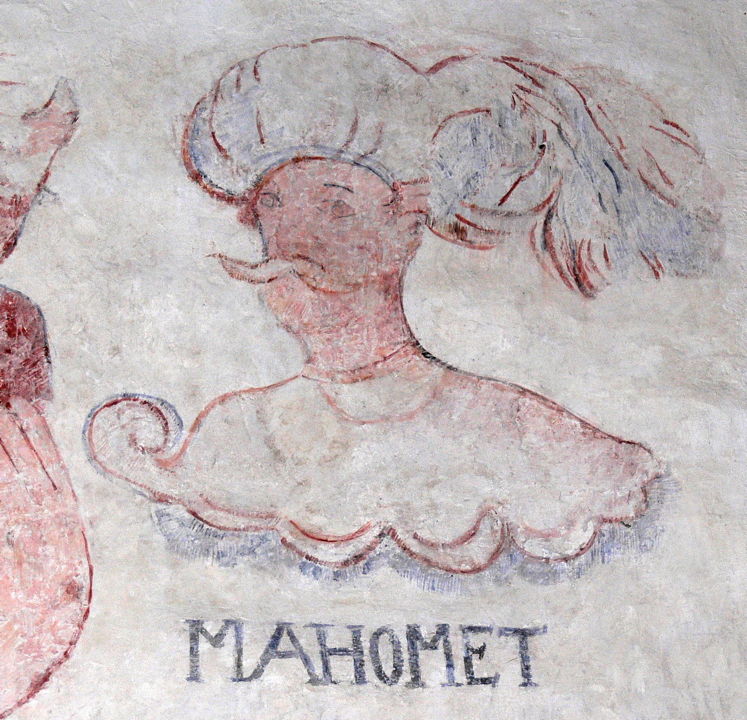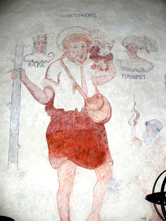 The church in the town of Gothem on the Swedish Island of Gotland features this wall painting, which depicts (from left to right) the Pope, St. Christopher, baby Jesus, and Mohammed. According to this scholarly paper (pdf file), "An early example of how Muhammad was used in the early reformation comes from a wall painting in the Gothem church on Gotland (an island situated on the East coast of Sweden).... The painting depicts St Christopher, Jesus as a child, the Pope and Mohammad. St Christopher caries the child on his shoulder, saving it from the water in which the Pope and Muhammad perish. How do we understand this painting? The propaganda is directed towards Catholicism. The drowning, nameless pope is humiliated by being associated with Muhammad and Islam; the false prophets perish together." The author of that paper, Professor Jonas Otterbeck, emailed the Archive to report that recent discoveries have likely pinpointed the date of the mural to the year 1673, and not the 16th century as earlier assumed, and that it was painted by artist Johan Bartsch Jr.