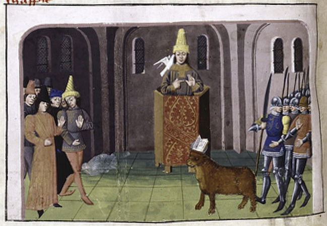 Mohammed preaching, with historically inaccurate landscape and clothing (a common problem in medieval and Renaissance paintings, which usually showed fashions contemporary with the time the painting was made, rather than costumes of the era depicted). Illustration ca. 1400-1425, taken from Boccaccio's De Casibus Virorum Illustrium (early 15th-century French translation by Laurent de Premierfait); drawn by the "Master of Rohan." The manuscript is currently in the Bibliothèque Nationale de France. The same illustration in the context of its manuscript page can be seen here. According to the iconography of the time, the dove on Mohammed's shoulder indicates that he is a false prophet trying to convince his listeners that he is associated with the Holy Spirit (of which the dove is a symbol).