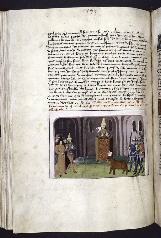 The handwritten manuscript known as the Chroniques Martiniennes, made in France in 1475, contains this miniature painting of Mohammed preaching while wearing European-style early Renaissance-era attire. As with other portraits of him from the period, the presence of the dove indicates that he is a false prophet. In the collection of the New York Public Library, from which these images were taken. The full manscript page, with the painting in context of the handwritten text, is on the left; and on the right is a low-resolution close-up of just the painting from the full-page image. Although the library's catalog listing for the image says it was created in "1475 (Approximate)," the notes for it say "De Ricci dates this to 1458, the year it was translated for Louis de Laval. Notes in dossier give the date as ca. 1461," so it could be from slightly earlier than 1475.