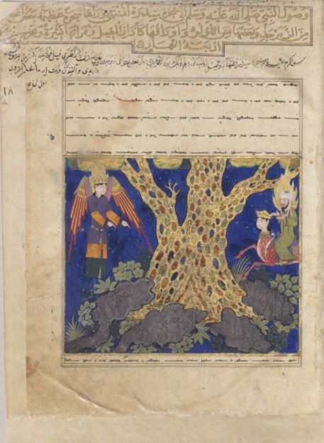 Picture depicts Muhammad in the middle with his veiled daughter Fatima to his left, his cousin and son in law Ali on his right hand, and grandchildren, Ali and Fatima's two sons, Hasan (in green) and Husain (in red). "The holy family" has a high position among all Muslims, but especially among Shia Muslims. Their names are written in the rosette to the left, top says "Allah", then follow clockwise: Muhammad, Fatima Husain, Hasan and Ali. ... Behind Muhammad is the messenger Djibril (Gabriel) with Quran in his hands. ... On this as on other pictures of Ali, he keeps one of his characteristics in his hands, sword [Zulfiqar] with the characteristic double header.These icons of Mohammed rocketed to momentary fame in early 2006 when at the height of the uproar over the "cartoon crisis" the Danish newspaper Jyllands-Posten linked to the previously obscure University of Bergen site to prove that Muslims themselves often depict Mohammed, debunking the trumped-up claim that there is a universal taboo against such representations. The article at Jyllands-Posten was, however, subsequently deleted, although the Bergen source page remains online to this day.