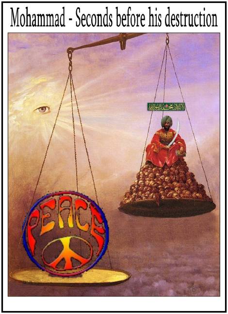 "Mohammad -- Seconds before his destruction," is the title of this anonymous allegorical montage, which depicts Fate or God judging Mohammed on the Scales of Justice and finding him outweighed by Peace. It was originally posted at the now-defunct "muhammad-cartoon" site.