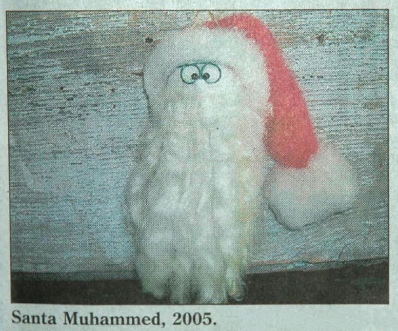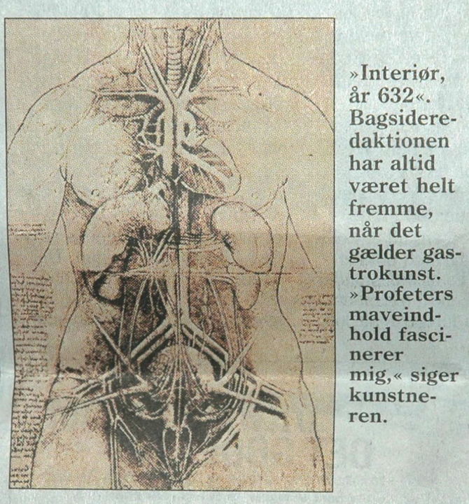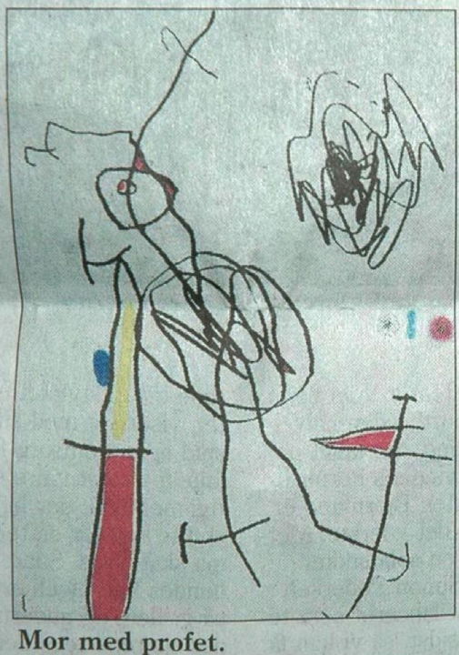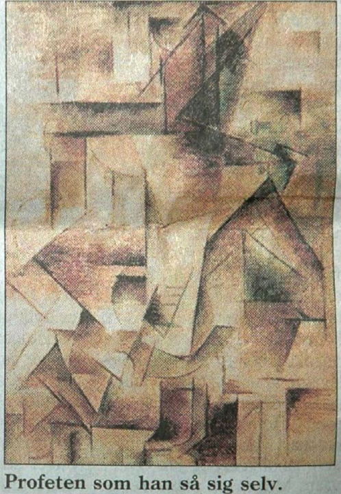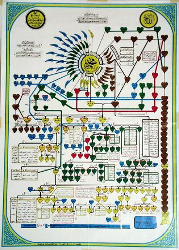 More common than portraits of the Prophet Muhammad are more or less schematic representations of his family or genealogical tree, or so-called "prophet trees", where the Prophet himself may be symbolized by a calligraphic representation of the name "Muhammad", and/or a rose. In this family tree we find the Prophet's name in the middle of the upper part, with near relatives, wives and children and descendants below. The medallion in the right corner contains the sentence Allah jalli jalaluh, "God, Mighty and Glorious is He!" In the left corner medallion: "The magnificent family tree of our lord Muhammad, God's messenger, God bless him and grant him salvation, and the people of his house (his family and descendants)." Original: 50x70 cm. Purchased in Cairo in front of the Sayyidna Husain-mosque January 1988 by Richard J. Natvig.