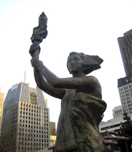 The centerpiece of the park is a contemporary bronze statue of the "Goddess of Democracy," modeled after a styrofoam original created by protesting students in Tiananmen Square in Beijing in 1989.