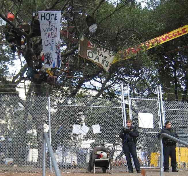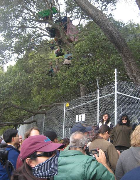 In 2006, the University of California announced plans to build an athletic training center next to Memorial Stadium on the U.C. Berkeley campus. But the construction of the new building would entail the removal of several trees currently occupying the proposed site. A cry to "Save the trees!" spread throughout the local activist community, and a small protest movement quickly arose to stop the training center. Although everything the university does elicits some kind of protest, this one, as trivial as it might have first appeared, soon became a cause célèbre.