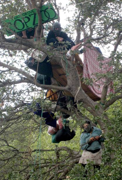 Above it all, the masked tree-sitters looked down on the festivities from behind the barbed wire, unable to attend their own party.
