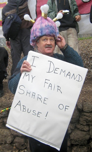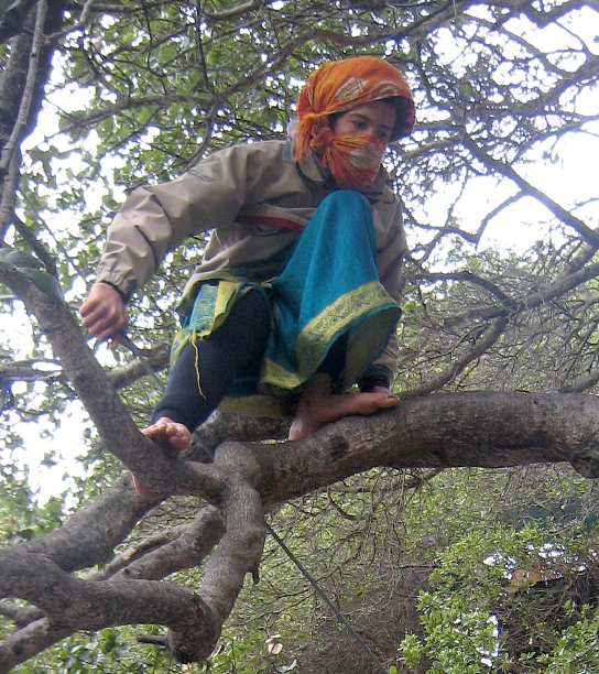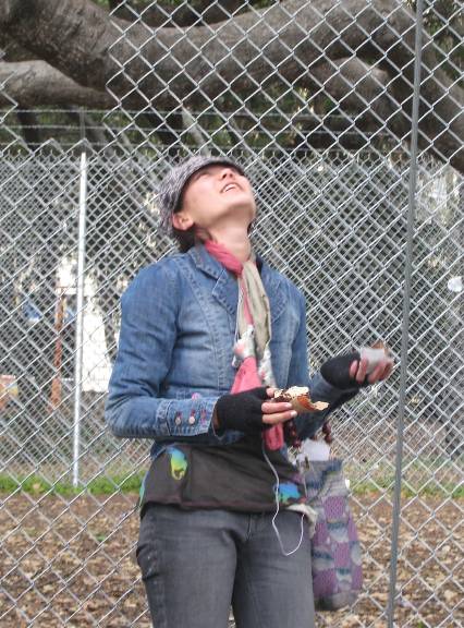 ...she took a slice of birthday cake, and called up to one of the tree-sitters, who climbed down low enough for her to hand it up to him, in an intentional violation of the court order against feeding the protesters. (Notice the policeman in the background running over to film the scene.)