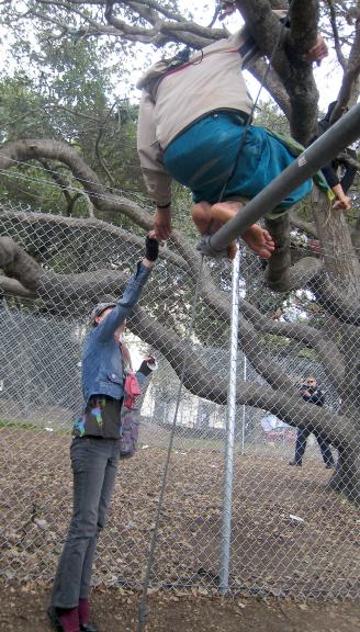 The police had built a fence around the small grove of trees, after a judge ruled the tree-sit illegal and gave the university permission to remove the protesters at any time. But instead of bodily removing them, and thereby causing a big fracas, the police tried a different tactic: fence off the grove, and force the tree-sitters to leave of their own volition, since the court ruling also forbids anyone from providing food or assistance to the illegal occupiers. So the party was forced to take place on the adjacent sidewalk, while the tree-sitters had to watch from the branches above.