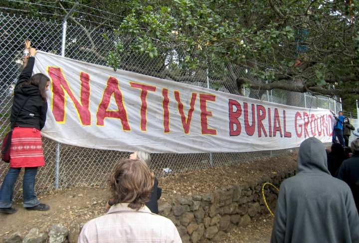 But that bit of civil disobedience was just a warm-up to the party's main event, which was a mass flaunting of the court order by handing up baskets of food to the tree-sitters. The protest organizers unveiled a massive banner that said "Native Burial Ground" (a ridiculous claim based on reports that the original stadium construction crew in 1923 found some human bones in the area, but there was never any evidence that they were Native American, nor ancient, nor that they were part of a "burial ground"; they just as easily could have been the remains of a modern murder victim or accident victim). The words on the banner were actually irrelevant since its sole actual purpose was to block the police from videotaping the ritualistic food donation.