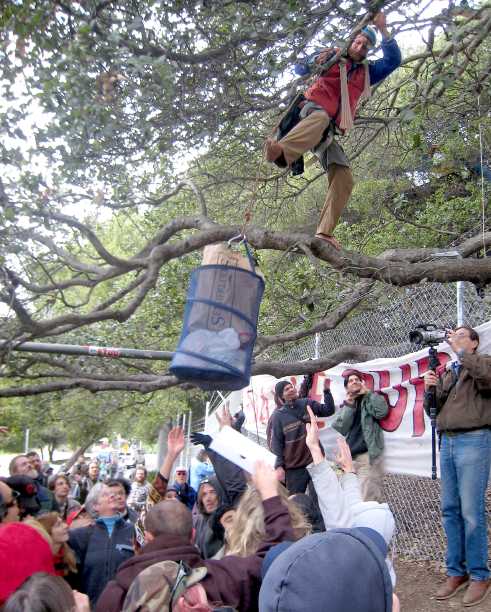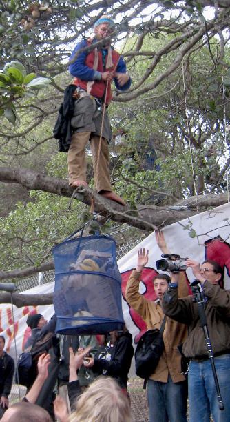 Up, up the basket went to one of the treehouses. And the process was repeated several times, to great acclaim from the ground crew -- even when the occasional bottle of water or bag of food would plummet down after slipping through the tree-sitters' fingers, nearly missing the celebrants below.