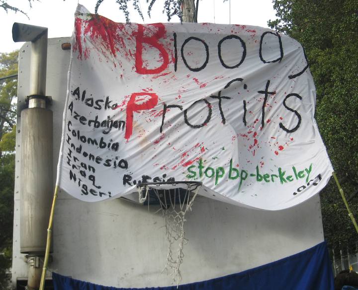 Berkeley is always a delicious source of unintentional irony. The energy company BP recently entered into a partnership with the University of California to fund research on alternative fuels. But BP (formerly British Petroleum) -- being an oil company -- is inherently evil, you see, so protesters unveiled this banner attacking the partnership -- right next to the sooty, grimy exhaust pipe of the protest bus.