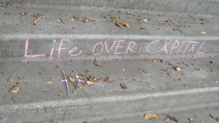 The police tried to lift their cameras over the banner, and a "visibility arms race" ensued with the protesters raising the banner higher and higher to block the police cameras, and then placing their placards in the way when they couldn't raise the banner any further. Some people took dollar bills out of their pockets and displayed the reverse sides of them to the police; I'm still unsure what the purpose of this gesture was. What is it about the reverse side of a dollar bill that would be of interest to the police?
