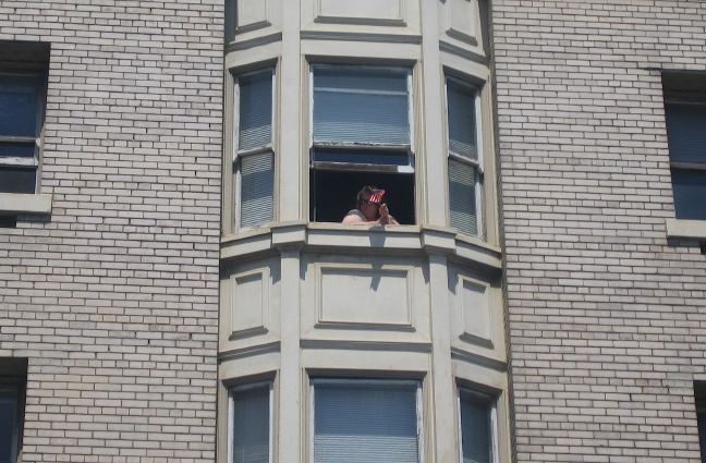 As the march passed through the city, this lone woman high up in a building waved a small American flag -- the only sign of dissent in sight.