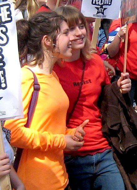There's only one kind of picture I ever get requests for: "protest babes," as they have come to be called. The public (or at least a certain segment of the public) can't seem to get enough of them. And I've certainly noticed that whenever I append these types of images to the end of a report, my visitor statistics go way up. And so, theoretically to please my male chauvinist readers -- but actually to lure in unsuspecting Web surfers looking for sexy pictures but who will instead get a dose of politics as they scroll down to the bottom of the page -- I give you: